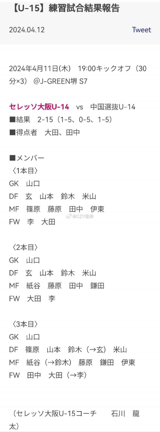 04月12日讯 据博主“莱斯特城的小狐狸”报道,赴日拉练的中国U14国少在昨天以15-2狂胜大阪樱花梯队。
