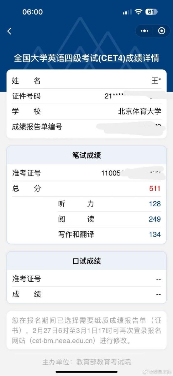 从王伟晒出的照片看,他的综合素质成绩为76分、教育知识与能力成绩为84分,体育与健康学科知识与教学能力成绩为83分。值得一提的是,王伟今年2月晒出过自己英语四级的成绩,他考了511分。